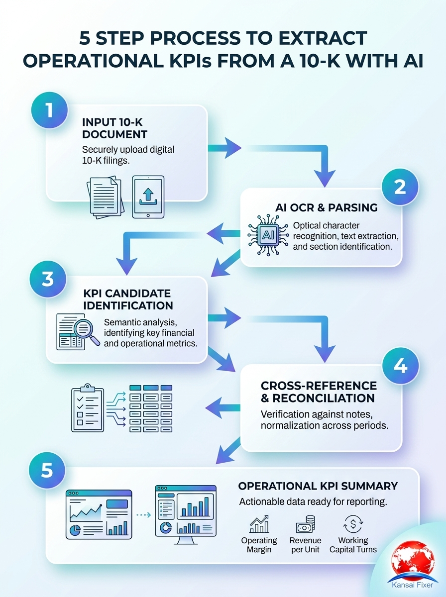 This infographic outlines a 5-step AI workflow to extract operational KPIs from a 10-K filing. Use it to quickly convert annual report data into actionable metrics.